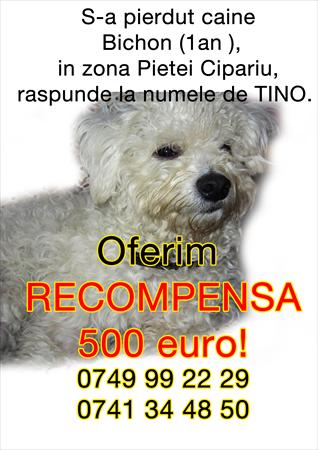 Cainele raspunde la numele Tino are aproximativ 1 an de zile, este alb si cret si este bolnav. S-a pierdut Vineri 22 Iulie in jurul orei 12.00, a disparut de pe str. Traian Mosoiu nr. 33. (pe langa Piata Cipariu). Stapanii sunt hotarati sa ofere recompensa 500 euro.