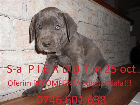 Pierdut,in data de 25 oct 2011,puiut de Cane Corso Gri,,mascul,in varsta de 2 luni jumate,cu coada si urechile netaiate,in zona FLoresti,CLuj.Gasitorului,recompensa substantiala.0746.601.638