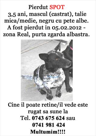 Pierdut SPOT, 3,5 ani, mascul (castrat), talie medie, negru cu pete albe. A fost pierdut in 05.02.2012 - zona Real, CLUJ.