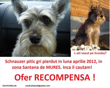 Inca il cautam pe Scooby, s-a pierdut in luna aprilie 2012 in zona SANTANA DE MURES. este un schnauzer pitic gri, varsta 7 ani, urechile ridicate, nu atarna. oferim RECOMPENSA