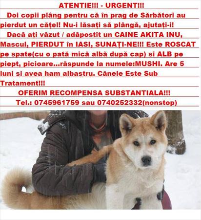 PIERDUT CAINE, mascul, AKITA INU, IASI, ROSCAT CU ALB, 5luni, raspunde la numele MUSHI, are microcip