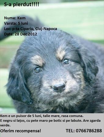Kem e in puisor de 5 luni de talie mare, rasa comuna. E negru si latos, cu pete maro pe botic si labute.Are zgarda verde. S-a pierdut in zona p-ta Cipariu, Cluj-Napoca Oferim recompensa!